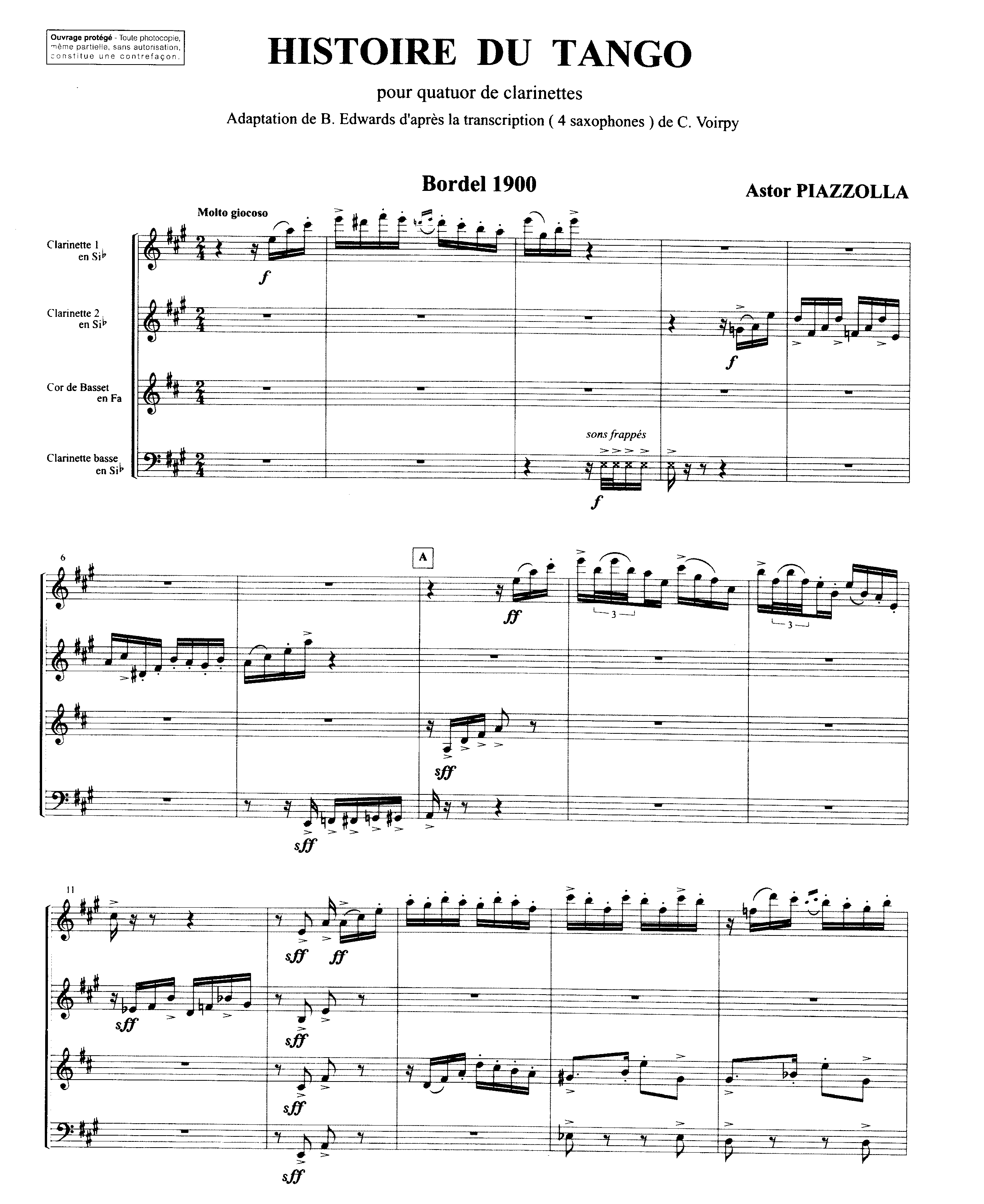 The tango was born in Buenos-Aires in 1882. It was first played on the guitar and the flute. The piano was added later, followed by the bandoneon. It is music full of charm and vivacity, that gives the impression of the good spirits and volubility of theFrench, Italian and Spanish women who lived in these brothels, enticing the policemen, thieves, sailors and hoodlums who visited them. The tango is cheerful.