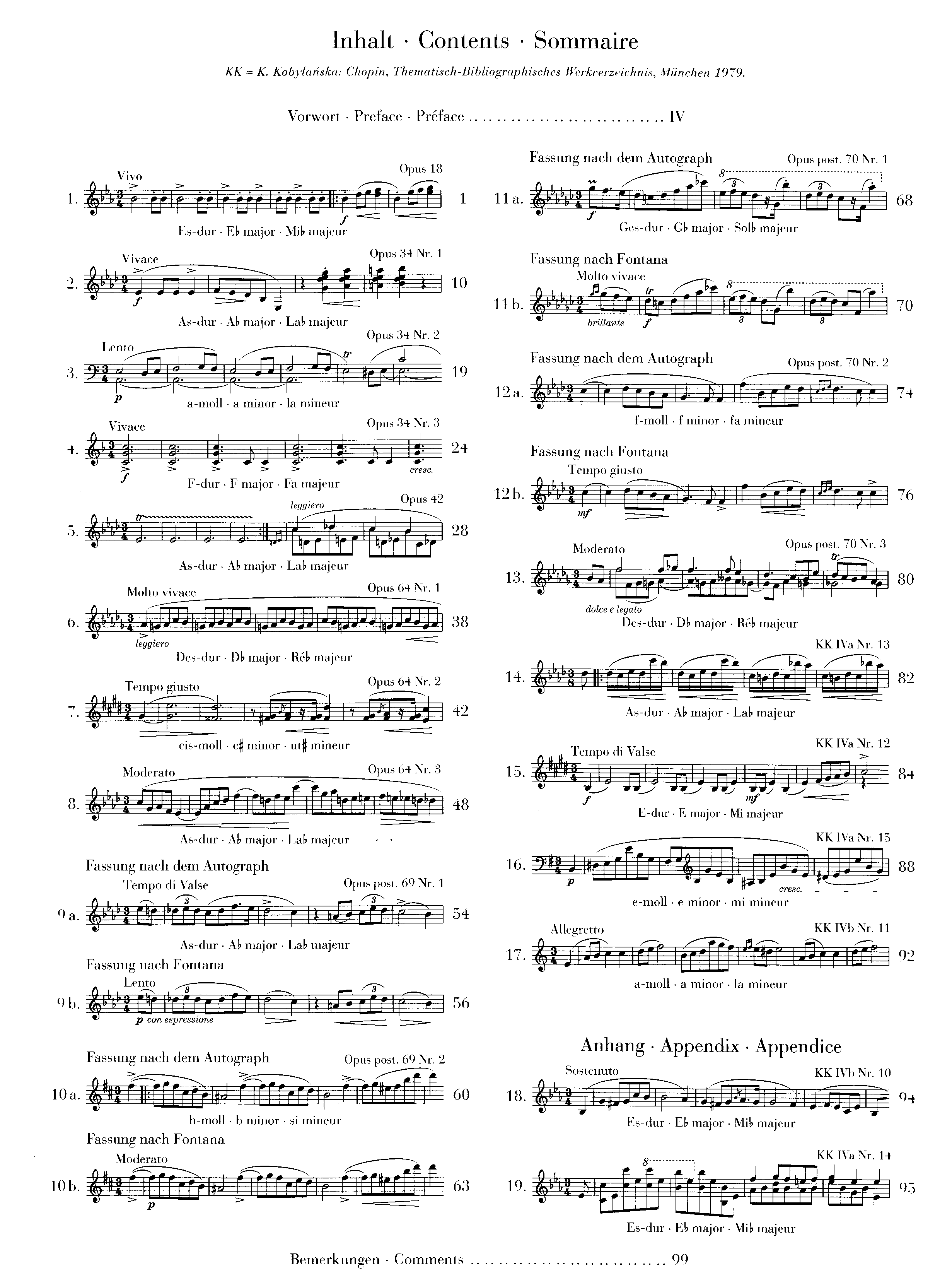 G. Henle URTEXT edition. Chopin revolutionized the etude - but he ennobled the waltz. He spent much time on this genre throughout his life and created a wide spectrum of forms, from virtuosic showpieces - the Grandes Valses Brillantes - to deeply melancholic atmospheric pictures. All these works have one thing in common: one cannot and should not dance to them! Our volume contains all of the waltzes that were published during Chopin's lifetime, or posthumously, including popular masterpieces suchas the so-called "Minute Waltz" (op. 64 no. 1). In cases where two authentic versions of the same waltz have been transmitted, we naturally give the Urtext of both versions. Includes: • Waltz in Eb, op. 18 - Grande Valse Brillante • Waltz in Ab, op. 34/1 • Waltz in Am, op. 34/2 • Waltz in F, op. 34/3 • Waltz in Ab, op. 42 • Waltz in Db, op. 64/1 - Minute • Waltz in C#m, op. 64/2 • Waltz in Ab, op 64/3 • Waltz in Ab, op post 69/1 (two versions) • Waltz in Bm, op post 69/2 (two versions) • Waltz in Gb, op post 70/1 (two versions) • Waltz in Fm, op post 70/2 (two versions) • Waltz in Db, op. post. 70/3 • Waltz in Ab, KK IVa,13 • Waltz in E, KK IVa,12 • Waltz in Em, KK IVa,15 • Waltz in Am, KK IVb,11 • Waltz in Eb, KK IVb,10 • Waltz in Eb, KK IVa,14