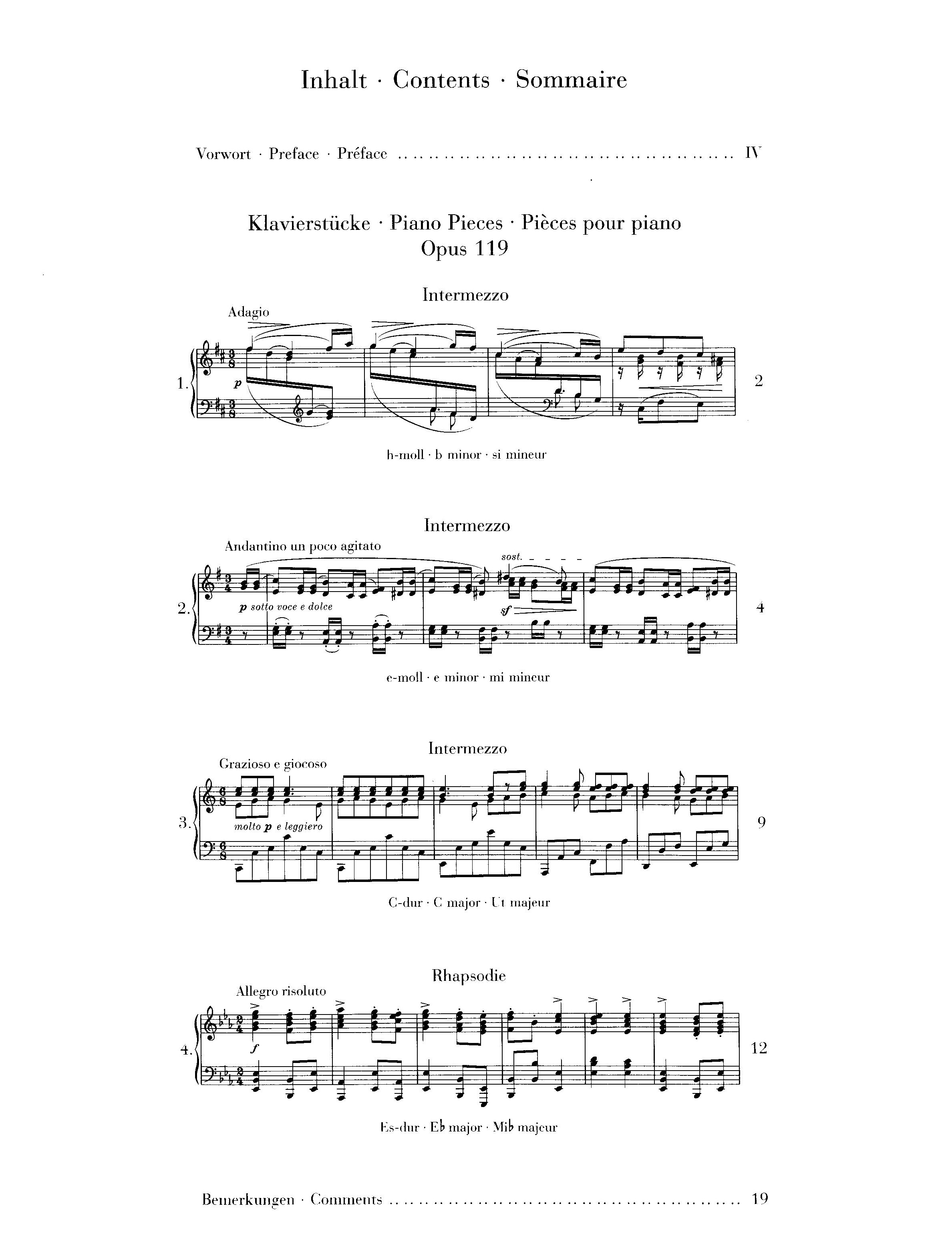 Romantic. Johannes Brahms' summer sojourn in 1893 in Bad Ischl was productive. Alongside the pieces op. 118, he also wrote his last cycle of piano pieces, opus 119. The composer wrote to Clara Schumann of the opening work, saying that it was teeming withdissonances and that: "every measure and every note must sound like a ritardando, as if one wanted to suck the melancholy out of each single one, with lust and pleasure out of the aforementioned dissonances!" Yet opus 119 contains something for every mood: No. 3 surprises with its lively and light C major, and the cycle is completed with the defiant rhapsody in E flat major. Our revised edition, based on the Brahms Complete Edition, is an invitation to pianists to rediscover Brahms' complex cosmos. -the publisher