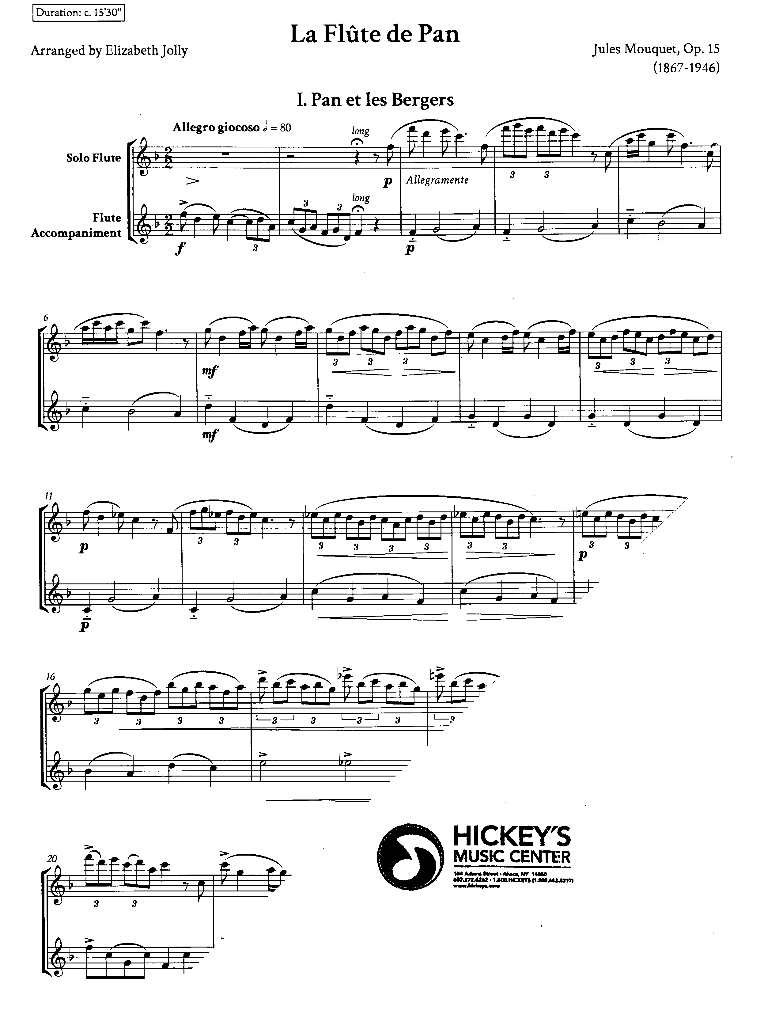 French composer Jules Mouquet (18671946) studied at the Paris Conservatoire and later became a professor of harmony there. His most famous composition, La Flute de Pan, Op. 15, is a flute sonata composed in 1904 that depicts scenes from Greek mythology featuring the god Pan. The three-movement work features lush harmonies and flowing melodies, blending late Romantic and early Impressionist styles, making it a favorite in the flute repertoire. This edition recreates the solo flute part from the piece's original publication, while the piano accompaniment has been arranged for a second flute player. The original rehearsal marks have been preserved, ensuring compatibility with other editions. Score & parts. - the publisher
