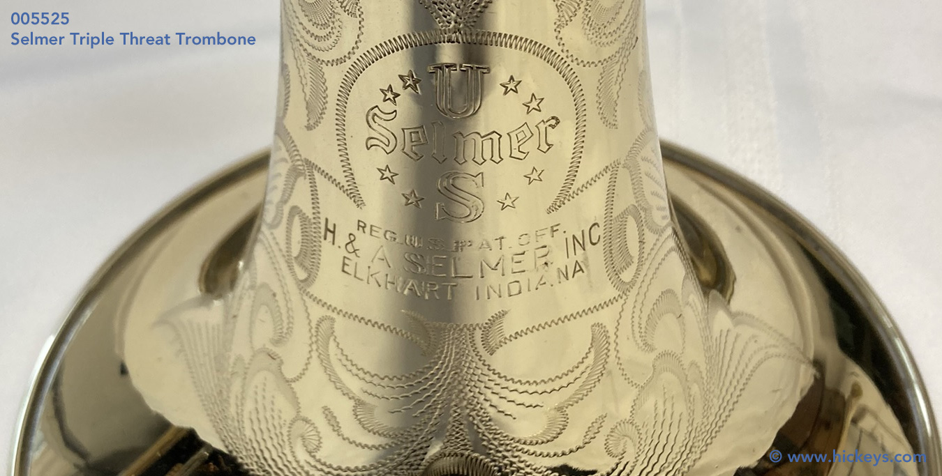 Bell Engraving: Selmer US logo. Maker's mark Reg. U.S. Pat. Off.; H. & A. Selmer Inc.; Elkhart, Indiana with elaborate flourish above and below. Artwork is deep set, stamped and engraved.