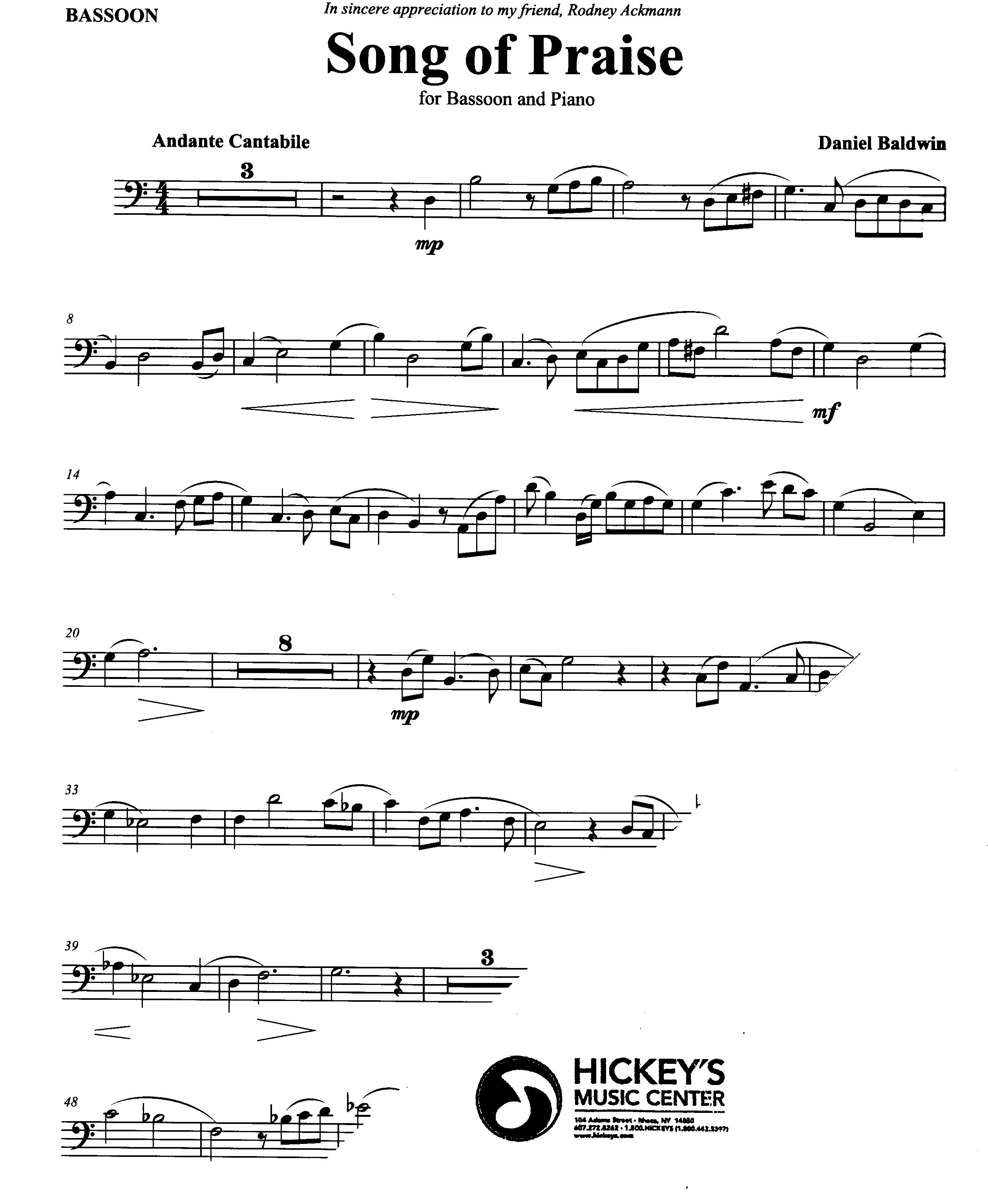 21st Century (2011). A quiet and prayerful song without words. This piece serves as a reminder that music and faith, no matter what events have transpired throughout history, have provided comfort and strength to the masses; and no matter what the dilemma, the most simple melody or smallest leap of faith can have a resounding influence on our lives and the lives of others. Song of Praise for bassoon and piano was premiered by bassoonist Rodney Ackmann at the International Double Reed Society Conference on June 3, 2011. -the composer