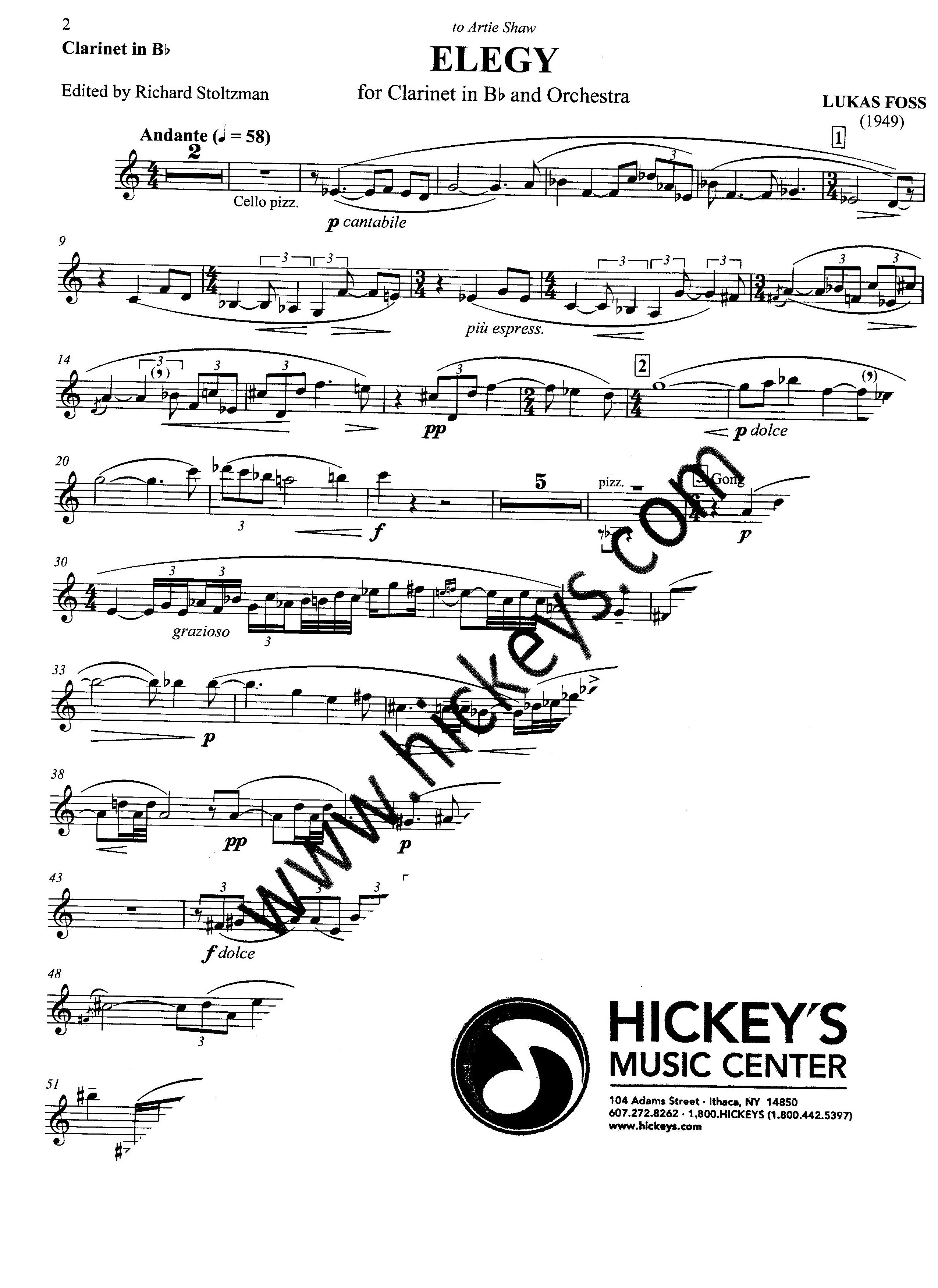 20th Century (1949). Lukas Foss was asked by Artie Shaw in the 1940s for a new work. Foss composed Elegy for clarinet and orchestra. The manuscript was given to Richard Stoltzman by Foss just before his death. Foss and Stoltzman concertized together for many years but never played this work. Stoltzman edited this beautiful work and presented the world premiere transcription for clarinet and piano in 2014. We are honored to publish this Foss gem in Richard Stoltzman's series for clarinet. -the publisher