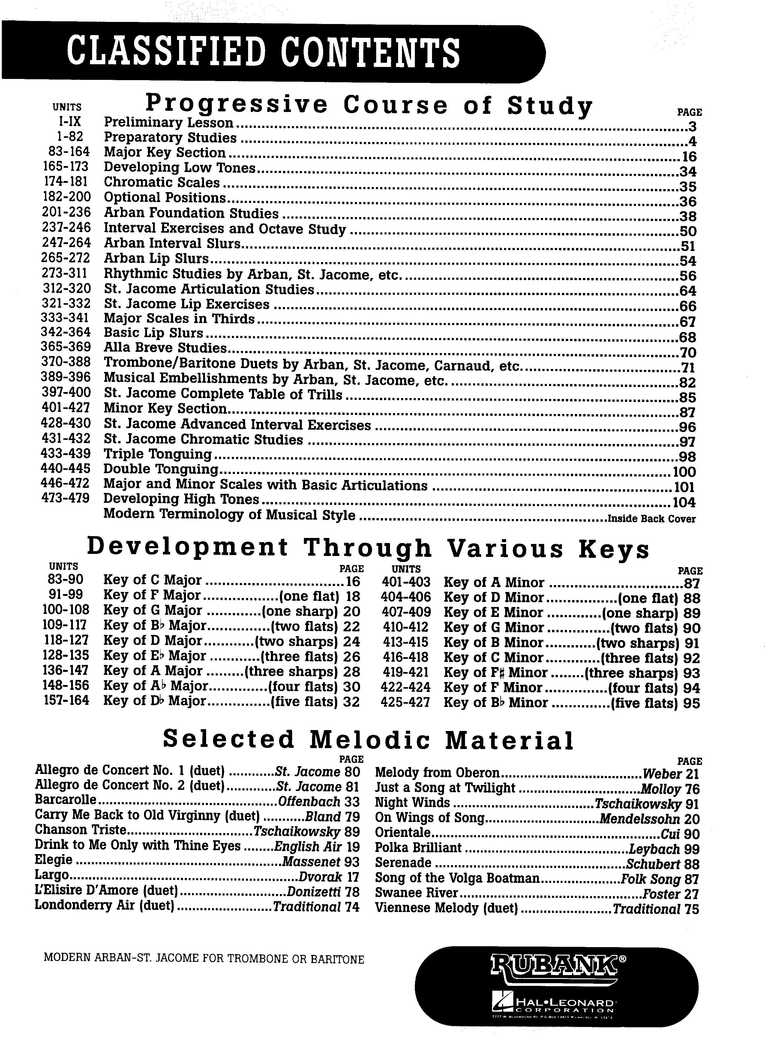 Part 1 (98 pages) contains the following: Foreword, Introduction, Alto Trombone Slide Chart, First Studies, Rhythmic Studies, Studies on Syncopation, Dotted Eighth Note and Sixteenth Notes, 6/8 time, Studies on the Slur, Lip Slurs and Flexibility Studies, Major Scales, Chromatic Scales, and Chromatic Studies.