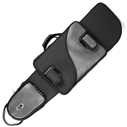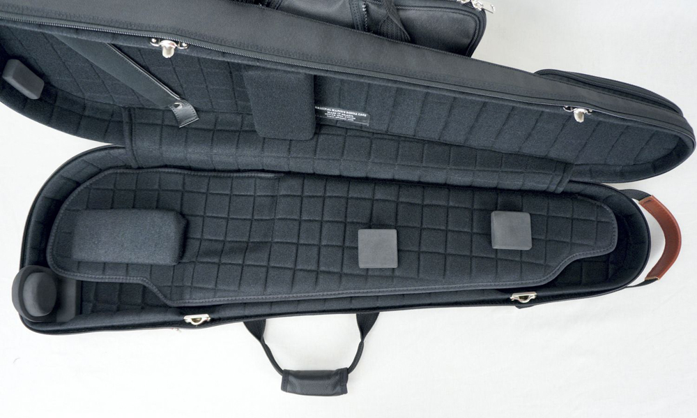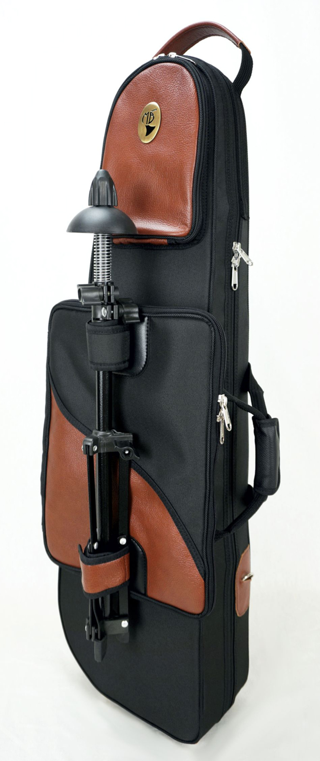 This model fits an alto trombone with a detachable bell, with or without rotary valves. The bell flare is attached to the lid of the case with an elastic belt. Accessories can be stored inside a pocket fixed with pressure buttons, and in the exterior front sheet music bag. A trombone stand can be attached to the sheet music bag. Features include: